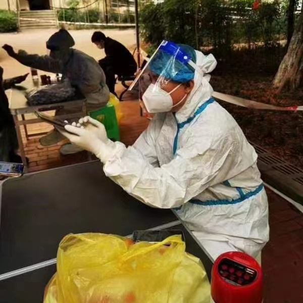 11月15日,接到沙坪坝区双碑街道自由村社区通知,双碑首创城小区由于有三例确诊病例,小区1、2、4栋楼全部封闭,急需医务人员上门挨家挨户进行核酸检测,排查出阳性患者。按照市里“高质高效开展核酸筛查、精准快速追阳找阳,把重点风险人员更快转运出去”的防疫要求,李显清主动请缨马上加入了社区志愿者服务队伍,配合社区和医务人员进行上门核酸检测工作。